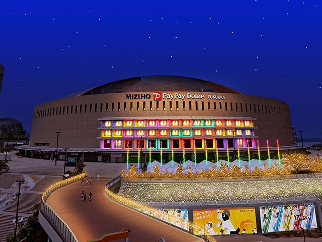 カラーボールで彩られた鮮やかな光のタワーは、思わず写真を撮りたくなるフォトスポットです。さらに、みずほPayPayドーム正面の花文字エリアにもイルミネーションを拡大。ドーム全体を包み込むように、色とりどりの光が輝きます。ドームを1周しながら楽しめるフォトスポットも多数登場。冬ならではの幻想的な光の世界を、ぜひご体感ください。