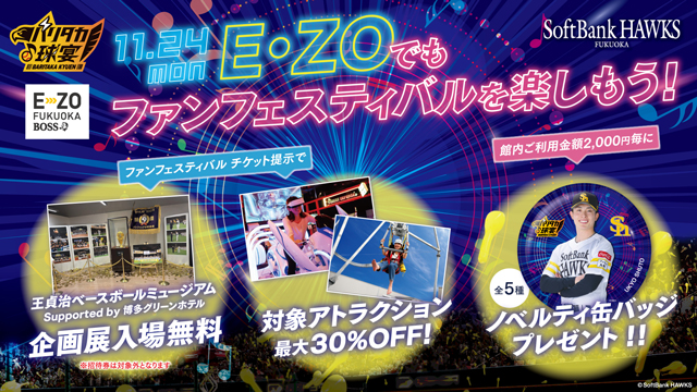 当日、BOSS E・ZO FUKUOKAご利用で限定ノベルティお渡しや、ファンフェスティバルのチケットをご提示いただくとアトラクション20%OFFクーポン(クラブホークス会員は30%OFF)&「王貞治ベースボールミュージアム Supported by 博多グリーンホテルで開催中の特別展示を無料でご観覧頂けます。オトクな情報をチェックしよう!