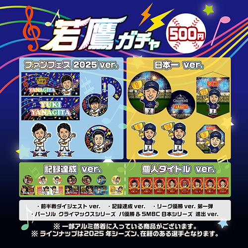 ファンフェスティバル2025のグッズ第2弾として、シークレットグッズや店舗限定のお菓子や若鷹ガチャが新登場!若鷹ガチャはファンフェスティバル2025ver.と2025シーズンの若鷹ガチャが混ざったアイテム。ぜひたくさん集めてください♪