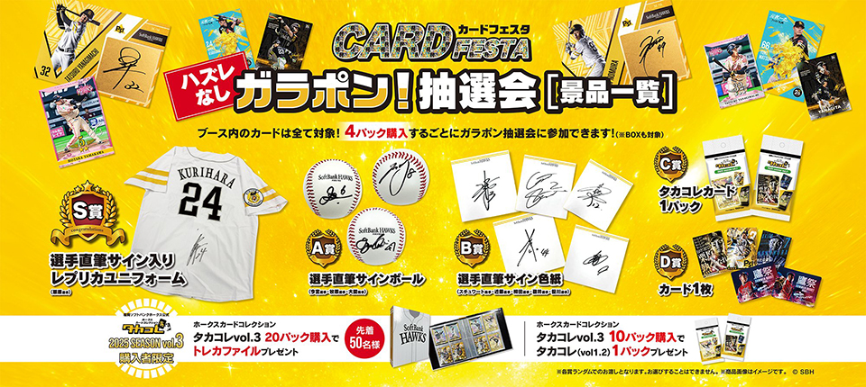 カード好きの皆さま必見♪カードを購入で景品が当たるカードフェスタを開催!対象のカードを4パックご購入ごとに、選手直筆サイン入りグッズなどが当たる、ハズレなしのガラポン抽選会に参加できます♪
