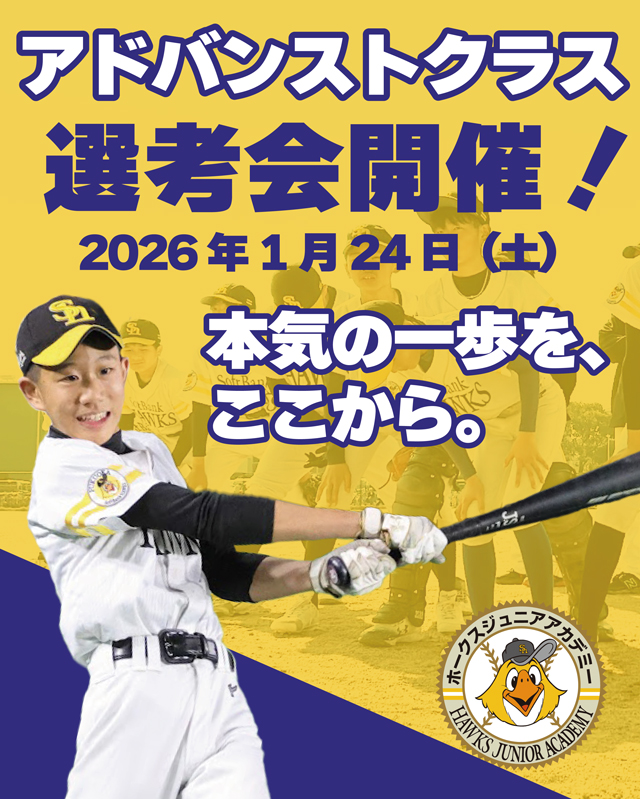 ホークスジュニアアカデミー ベースボールスクールでは、2026年1月24日(土)に新小学5年生・6年生を対象にしたジュニア最上級クラス「アドバンストクラス」2026年度生の選考会を開催いたします。