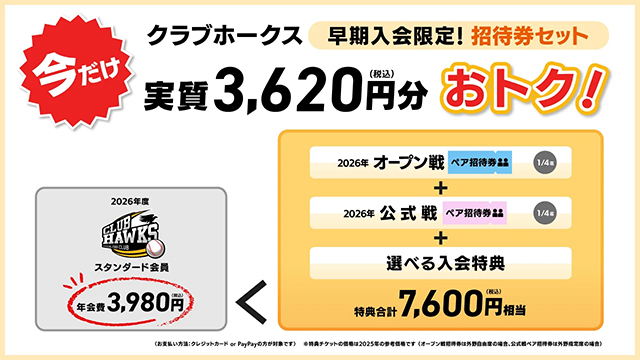 2026年度の入会特典はこちらからタカチケットからのご購入でホークス主催試合のチケットが割引価格に♪しかも購入手数料(1枚110円)が不要です。