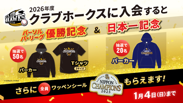 抽選で50名にパーソル パ・リーグ優勝記念「パーカー」または「Tシャツ」、20名様に「日本一記念パーカー」が当たる!2026年1月4日(日)までに、2026年度クラブホークス年会費をクレジットカードまたはPayPayでお支払い完了後、抽選イベントからエントリーください。
