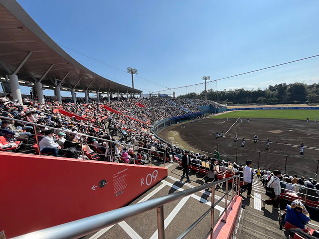 宮崎キャンプのメイン球場であるアイビースタジアムのバックネット裏上部スタンド席に設けられた観覧シートです。席位置は、スタンドの上段に位置し、スタジアム全体を見渡せる場所です。事前予約をして観覧席を確保できるので、遠方からお越しのホークスファンの皆さまも時間を気にする事なく、ご来場いただけます。うれしいお土産もついてきます♪