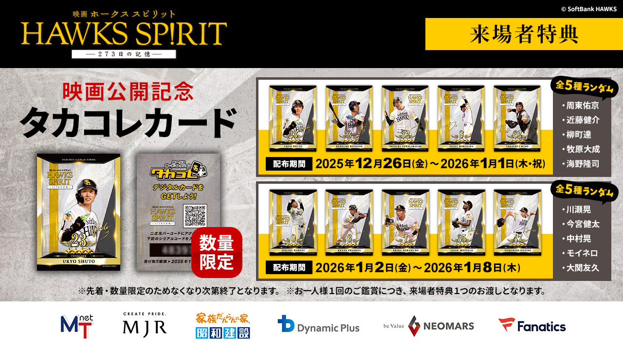 12月26日(金)に公開する長編ドキュメンタリー「映画 HAWKS SP!RIT -273日の記憶-」。この公開を記念し、来場者特典として数量限定で「映画公開記念タカコレカード」を配布することが決まりました。ここでしか手に入らない特別なカードを、映画とあわせてぜひお楽しみください!