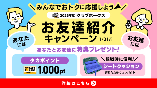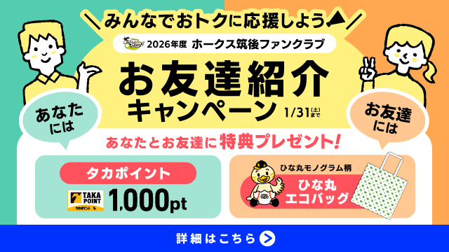 - (8)お友達が案内メールに記載された専用URLからホークス筑後ファンクラブへ新規入会いただくと紹介者特典の対象となります