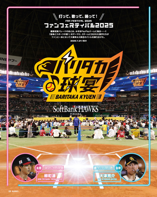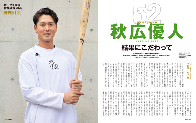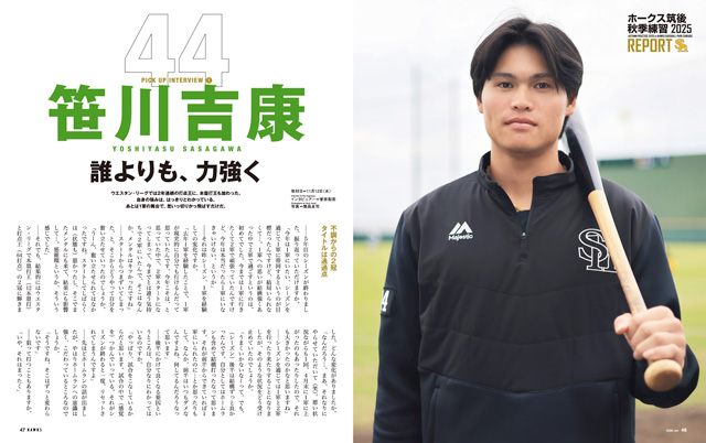 10月30日(木)~11月14日(金)まで行われていた「ホークス筑後秋季練習2025」も特集。インタビューは、2026年の年男でもある期待のスラッガー候補、笹川吉康選手と秋広優人選手の2選手です。そのほか、若鷹17選手に「オフシーズンのMyテーマ」を聞いてきました。2026年春季キャンプからのアピールに向けて、気合い十分です!