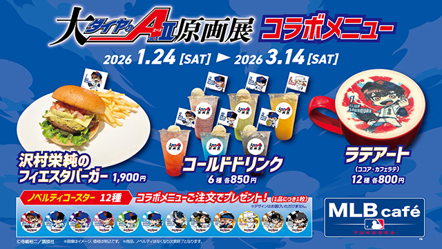 BOSS E・ZO FUKUOKA 3F「MLB café FUKUOKA」では、「大『ダイヤのA actⅡ』原画展」とコラボグルメを販売いたします!オリジナルのバーガーやドリンク、ラテアートなどをお楽しみいただけます。さらに、コラボメニューご注文でノベルティをプレゼント!この機会にぜひMLB café FUKUOKAにお越しください。
