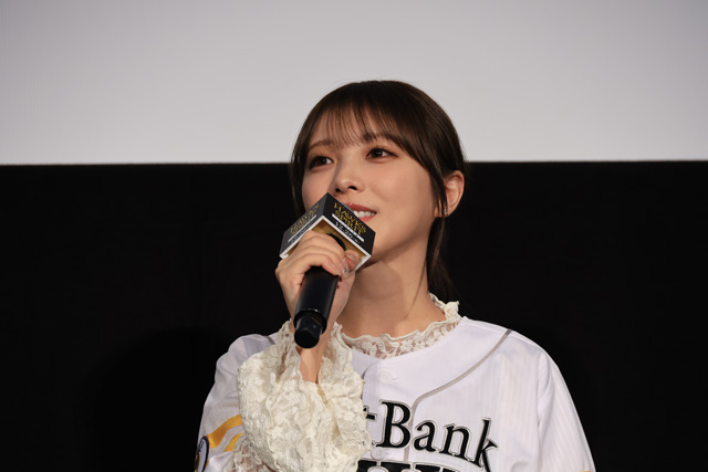 さらに当日は、映画のナレーションを担当した与田祐希さんもサプライズゲストとして登場。劇場内からは大きな拍手と歓声が沸き起こります。本格的なナレーションは今回が初めてということで「選手の皆さんの頑張りを私の声で伝えさせていただく。良いプレッシャーを感じながら」と収録を振り返ると、「ホークスの皆さんの苦悩や努力だったり、裏のちょっとおちゃめな部分もあって、いままで野球を見ていない人も心が動くような映画」とアピールしてくれました。