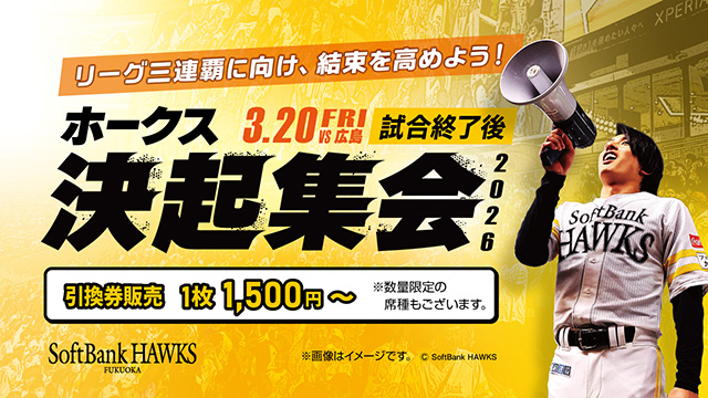 決起集会でホークス選手が登場する「ホークス応援指定席(1塁側外野エリア)」および、その中でもより選手を近くで見ることができる「選手『最』間近席」「選手間近席」のチケットを1月18日(日)10:00より販売!皆様のご参加をお待ちしております。