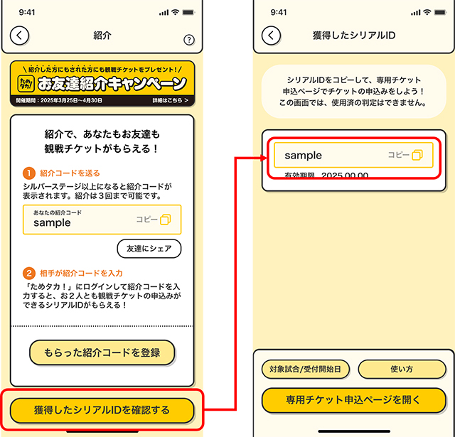 まだ「ためタカ!」アプリを利用したことがないお友達にアプリを紹介すると、紹介した方にもされた方にも観戦チケットをプレゼントします!