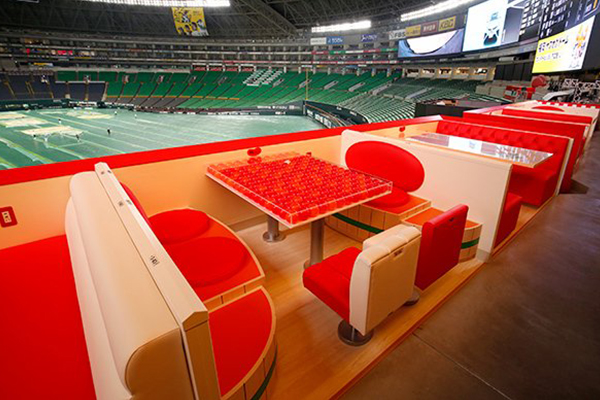 福岡のシンボルである「明太子」をモチーフにデザインした観戦シート。みずほPayPayドーム外野席の後方エリアで、大きな明太子のオブジェが目を引く「やまや めんたいこ BOX」は、1つのBOXで6名様までご利用が可能です。ご家族やご友人とのグループ観戦に最適な座席です。