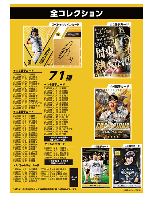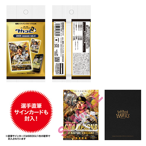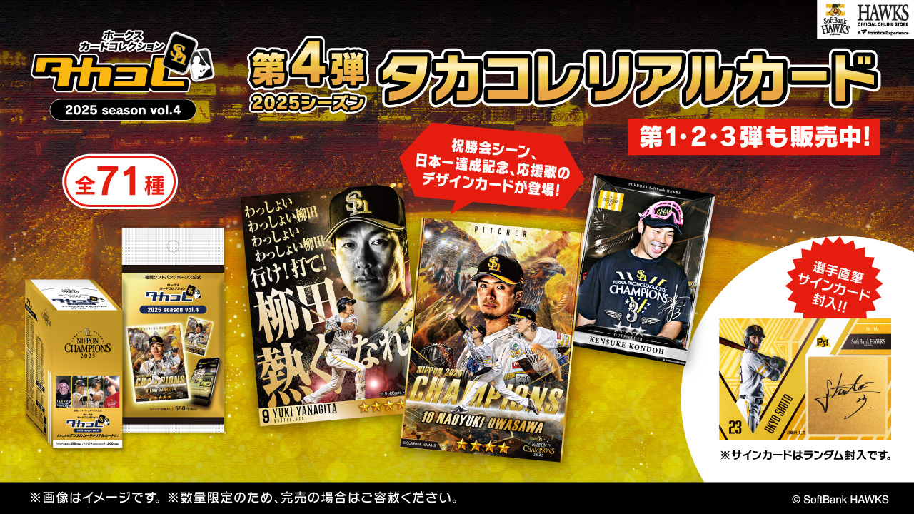 人気のタカコレリアルカード2025シーズン第4弾の販売がスタート!今回は、祝勝会シーン、日本一達成記念、応援歌のデザインカードが登場♪また、選手直筆サインカードには、周東選手や山川選手など多数の選手をラインナップ!選手直筆サインカードは、6BOXに1枚の確率で封入されています。