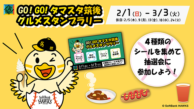 スプリングトレーニング期間中は、人気企画「GO!GO!タマスタ筑後グルメスタンプラリー」を開催!対象店舗でグルメを購入してシールを集めると、豪華景品が当たる抽選会にご参加いただけます♪