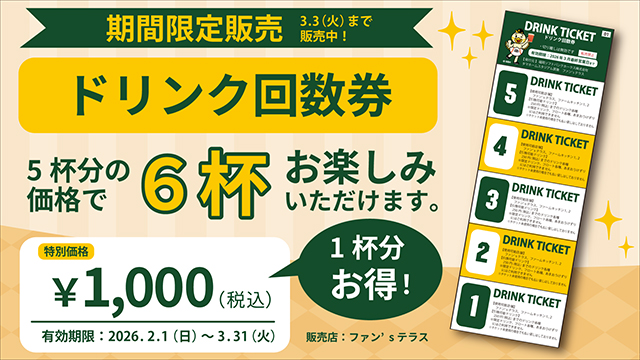 スプリングトレーニング期間中、とってもお得なドリンク回数券を販売します。