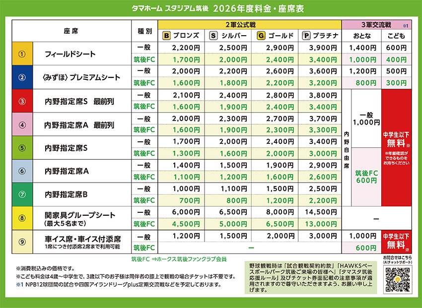 2026年より、タマホーム スタジアム筑後の内野指定席の座席区分および料金を一部変更いたします。