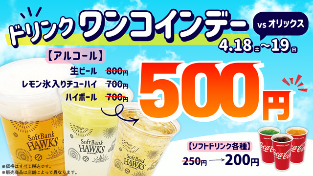 対象のドリンクが、ワンコインで楽しめる「ドリンクワンコインデー」を開催!観戦のお供にピッタリなドリンクを、お得にお楽しみいただけます♪