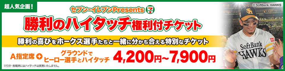 ホークスが勝利すればヒーロー選手とハイタッチできる超人気企画「セブン-イレブンpresents 勝利のハイタッチ権利付チケット」♪各日限定60名、セブン-イレブン・セブンチケット限定での販売となります。ホークス選手と触れ合える、またとないチャンス♬完売必至の人気チケットのためお早めにお買い求めください!
