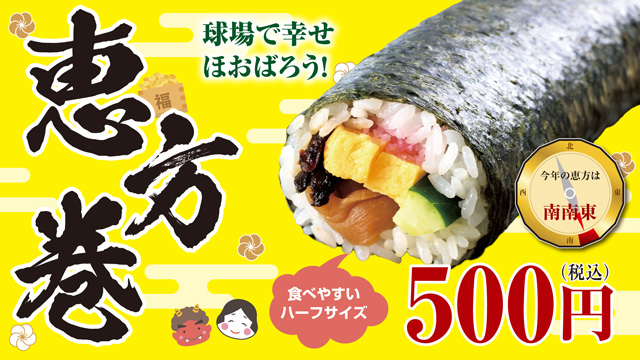 節分当日は、恵方巻を数量限定でご用意!グラウンドでは、選手が参加する恵方巻企画も行われるので、スタンドで観覧しながら恵方巻を味わうのもおすすめです♪