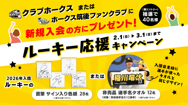 公式ファンクラブ「クラブホークス」または「ホークス筑後ファンクラブ」への新規入会&専用フォームからのエントリーで、2026年度に入団のルーキーの限定グッズが当たるキャンペーンを開催します。抽選で40名様にルーキー選手のサイン色紙または非売品タオルをプレゼントします。この機会にぜひご応募ください!