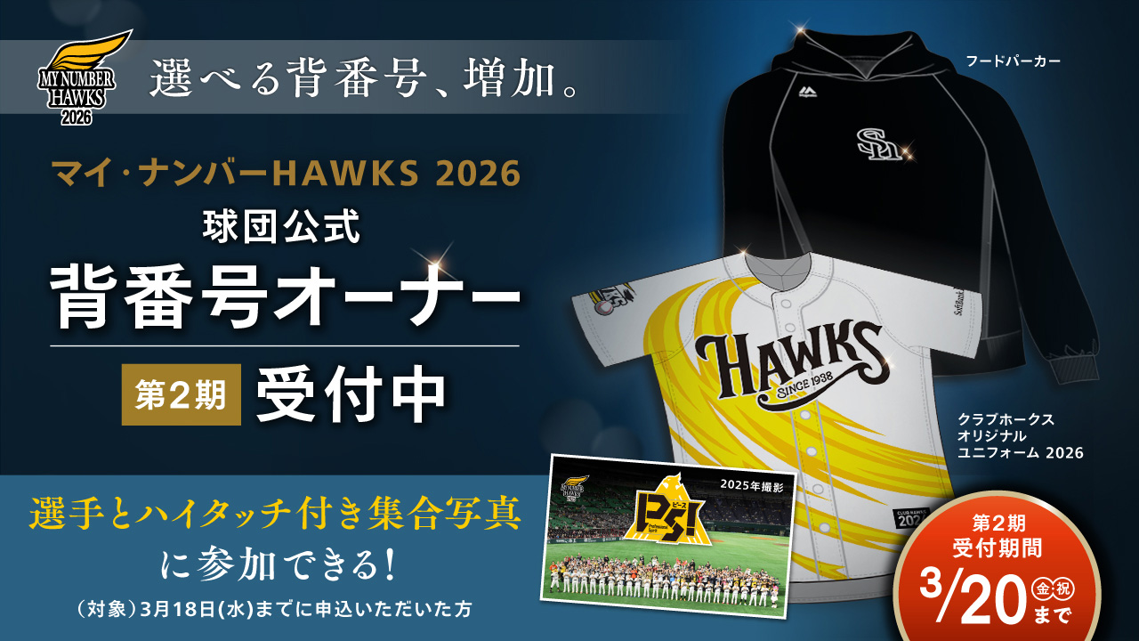 世界で1つだけの「背番号オーナー」になれる、マイ・ナンバーHAWKS 2026の第2期オーナー募集を本日2月3日(火)よりスタート!マイ・ナンバーHAWKSとは、福岡ソフトバンクホークス公式背番号オーナーとなり、お好きな4桁の背番号を選んで登録できるサービスです。ホークスの一員として選手と同じ、自分だけの背番号とネームが入った特別仕様ユニフォームなど豪華特典が手に入ります。そして第2期では選べる背番号が増加しました!第2期オーナーの申込締切は2026年3月20日(金・祝)まで!