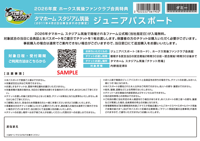 - ホークス筑後ファンクラブにご入会いただいた2011年4月2日以降生まれの方