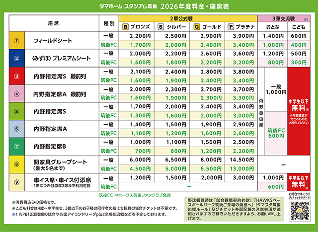 ファーム・リーグ公式戦の当日券は、タマスタ筑後 チケット窓口にてお買い求めいただけます。