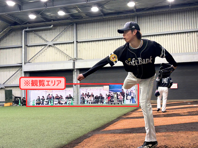 屋内練習場のブルペン観覧エリアは、スプリングトレーニング期間限定で開放中♪若鷹たちの熱い練習風景を、ぜひ間近でお楽しみください!