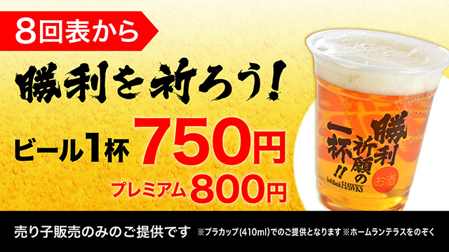 観戦終盤を盛り上げる人気企画売り子販売限定「勝利の一杯」が、「勝利祈願の一杯」としてリニューアルします。2026年より勝敗にかかわらず、8回表からオリジナルカップで生ビールを750円・プレミアムビールを800円で販売♪ビールを飲んでホークスの勝利を祈ろう!