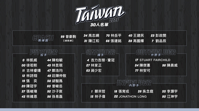 CPBL(台湾プロ野球)の蔡其昌コミッショナーが渡米し説得したかいもあり、メジャー通算18本塁打の外野手スチュアート・フェアチャイルド(ガーディアンズ傘下)、カブス3Aで昨季20本塁打の内野手ジョナソン・ロングという、2人の台湾系アメリカ人の招集に成功した。これに、CPBLの主力、NPB所属選手、MLB傘下の若手プロスペクトらが揃った陣容は、現状のベストメンバーに近いといえる。