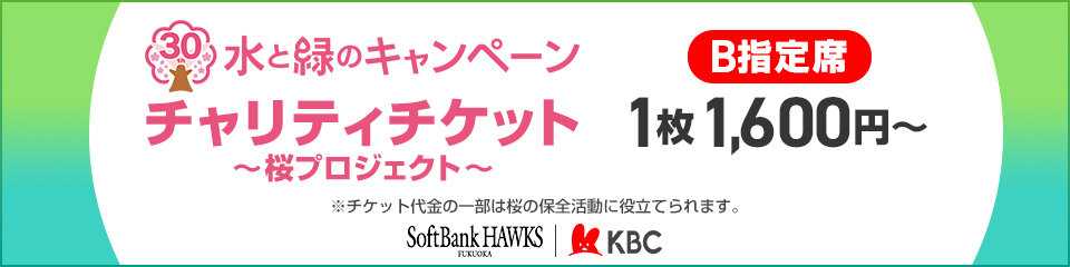 今年で30回目となる、KBC九州朝日放送「KBC水と緑のキャンペーン」のタイアップ企画として、4月5月の試合(弊社指定)が最大36%OFFで楽しめる、チャリティチケットを3月11日(水)10:00より販売します。チケット代金の一部は桜の保全活動に役立てられます。数限定販売につきご購入はお早めに!