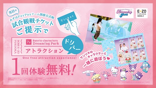 3月3日(火)~みずほPayPayドーム開催公式戦最終日まで、みずほPayPayドーム開催公式戦のチケットをご提示すると、BOSS E・ZO FUKUOKA 7F「サンリオキャラクターズ ドリーミングパーク」内のアトラクションが1回体験無料になるキャンペーンを実施!野球観戦にもぴったりなドリパーオリジナルグッズを販売しています!この機会に、ご家族やご友人とぜひお立ち寄りください☆