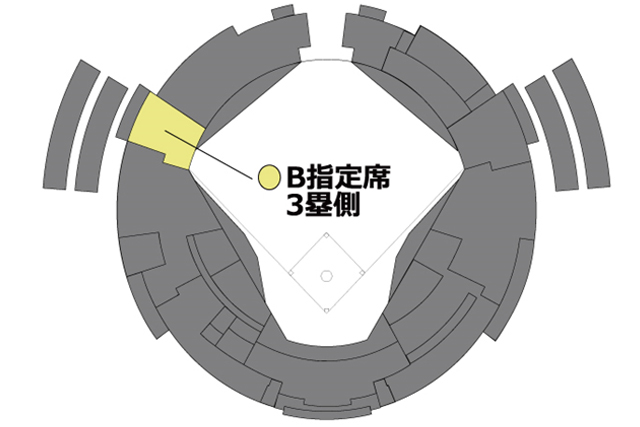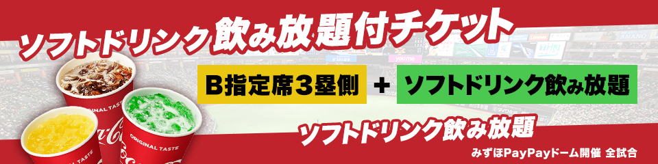 ご購入の際は必ず「ソフトドリンク飲み放題付チケット」をお選びください。通常のB指定席3塁側をご購入いただいても、「ソフトドリンク飲み放題」はご利用いただけません。