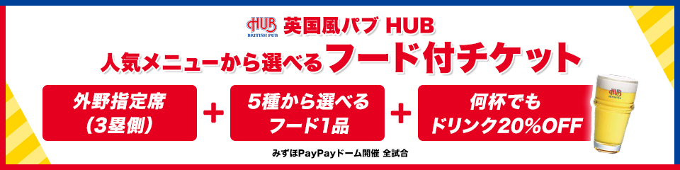 ご購入の際は必ず「【英国風パブ HUB】人気メニューから選べるフード付チケット」をお選びください。通常の外野指定席3塁側をご購入いただいても、「英国風パブ HUB」のフードやドリンク20%OFFはご利用いただけません。