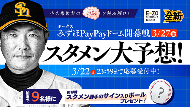 あなたが考える「開幕スタメン野手9名」を予想して応募しよう!見事予想を的中させた方の中から抽選で、開幕戦スタメン野手の直筆サインボールをプレゼントします。さらに応募者全員に、E・ZO限定「スローガンロゴステッカー」をもれなく進呈!