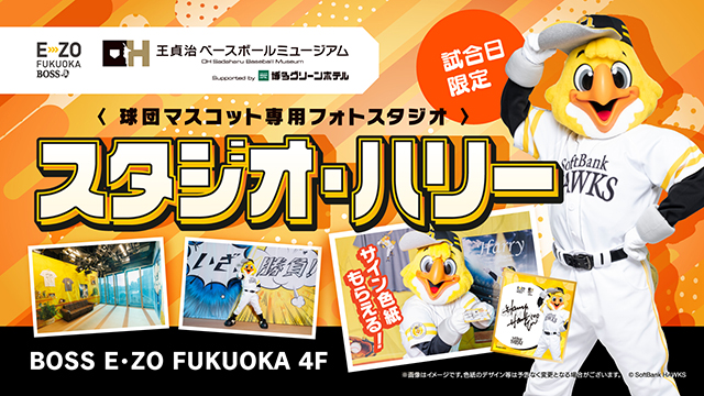 4F「王貞治ベースボールミュージアム Supported by 博多グリーンホテル」内の球団マスコット専用フォトスタジオ「スタジオ・ハリー」は2026年3月より、みずほPayPayドームにて開催されるホークス主催の試合日限定でオープンします!試合観戦と一緒に楽しんで、特別な思い出をつくろう!