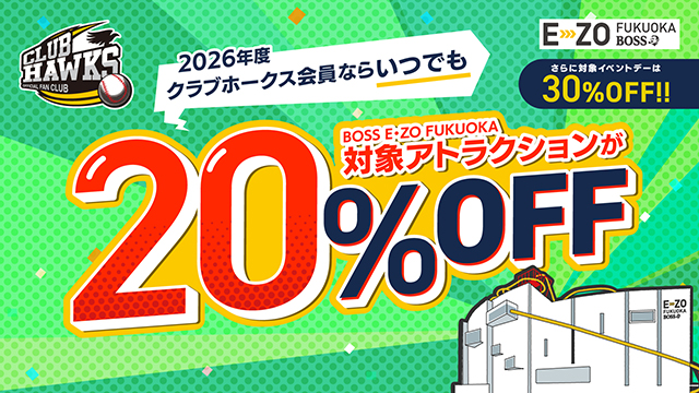 待ちに待った球春到来♪3月3日(火)よりオープン戦がスタートし、3月27日(金)には2026シーズンが開幕します。みずほPayPayドーム横の「BOSS E・ZO FUKUOKA」では、2026シーズンも野球観戦の前後に楽しめるさまざまな企画が盛りだくさん!野球もエンタメもE・ZOでお楽しみください!