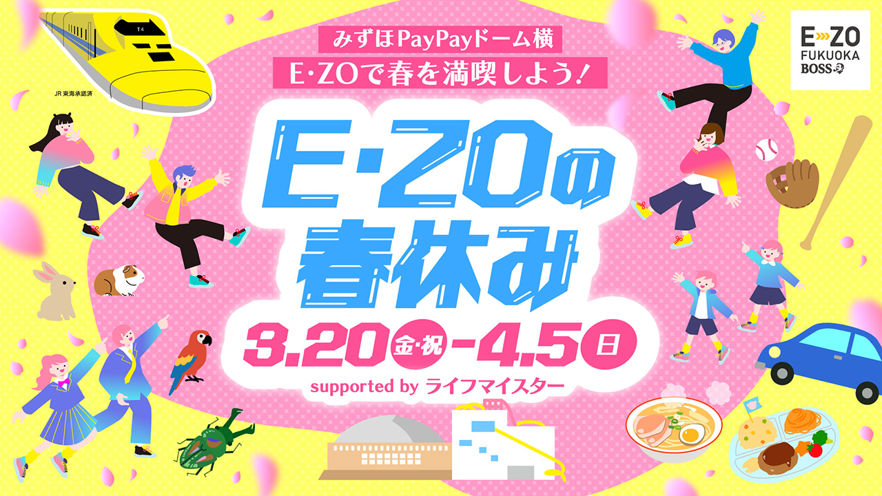 E・ZOで春を満喫しよう!!みずほPayPayドーム横の「BOSS E・ZO FUKUOKA」では、トミカとプラレールのイベントや昆虫展、野球関連施策、フィールド開放などなど子どもも大人も楽しめる企画が盛りだくさん!この春に開催するイベント情報をまとめてお知らせ!ぜひ試合観戦の前後はE・ZOで楽しもう!