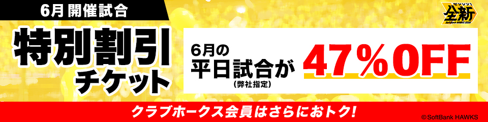 ご購入の際は必ず「【6月】 特別割引チケット」をお選びください。通常のS指定席、A指定席、外野指定席、ホークス応援指定席をご購入いただいても、割引価格ではご購入いただけません。またお支払方法はクレジットカード・PayPay限定となります。