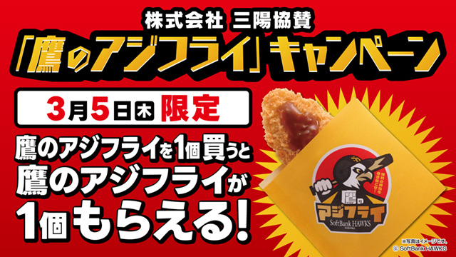 3月5日(木)限定で株式会社三陽協賛「鷹のアジフライ」キャンペーンを実施いたします。みずほPayPayドーム福岡の対象店舗で鷹のアジフライを購入すると限定先着3,000名様にアジフライ引換券をプレゼント!鷹のアジフライを食べて勝利を後押ししよう♪