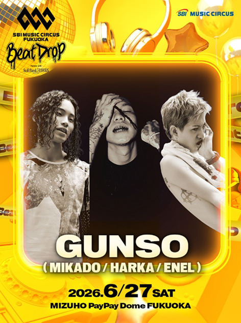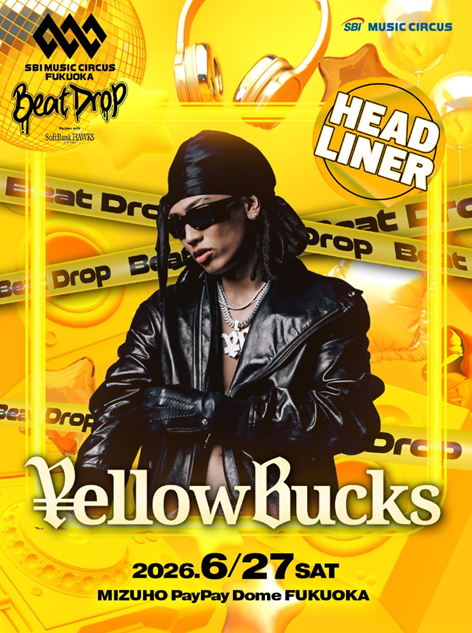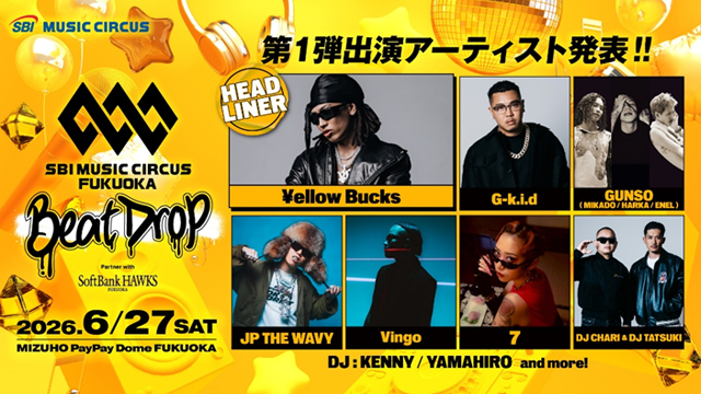 6月27日(土)みずほPayPayドーム福岡で開催する、HIPHOPを中心とした熱量あふれるパフォーマンスと迫力ある演出で音楽との一体感と高揚感を味わえるオールナイト音楽フェスティバル「SBI MUSIC CIRCUS FUKUOKA -Beat Drop- partner with SoftBank HAWKS」の第1弾出演アーティストを発表いたします。