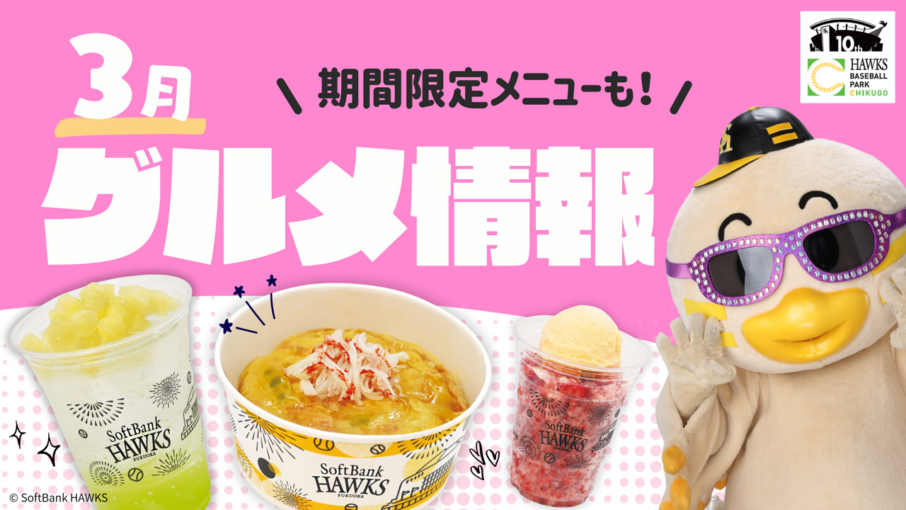 3月より、タマホーム スタジアム筑後では、HAWKSベースボールパーク筑後開業10周年を記念した限定グルメが登場!そのほか、春の観戦をさらに盛り上げるグルメ情報もお届けします☆