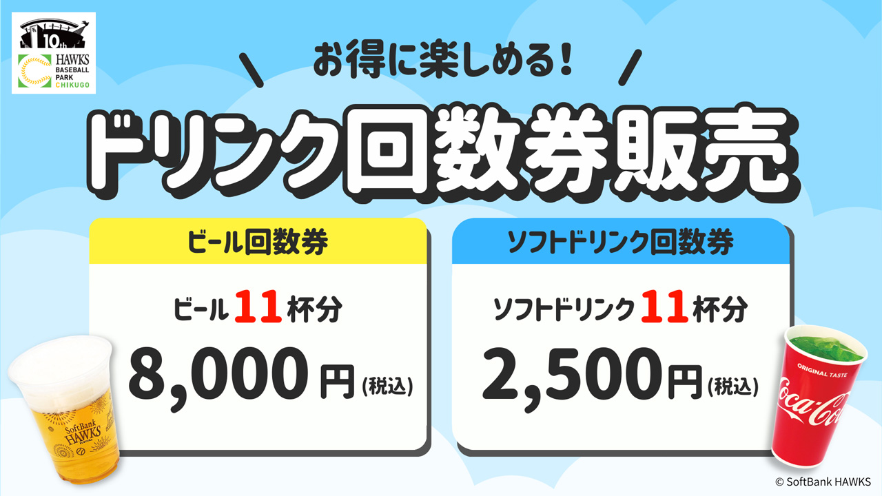 タマホーム スタジアム筑後では、3月17日(火)ファーム・リーグ ホーム開幕戦 広島戦より、「ビール回数券」「ソフトドリンク回数券」の販売を開始いたします。