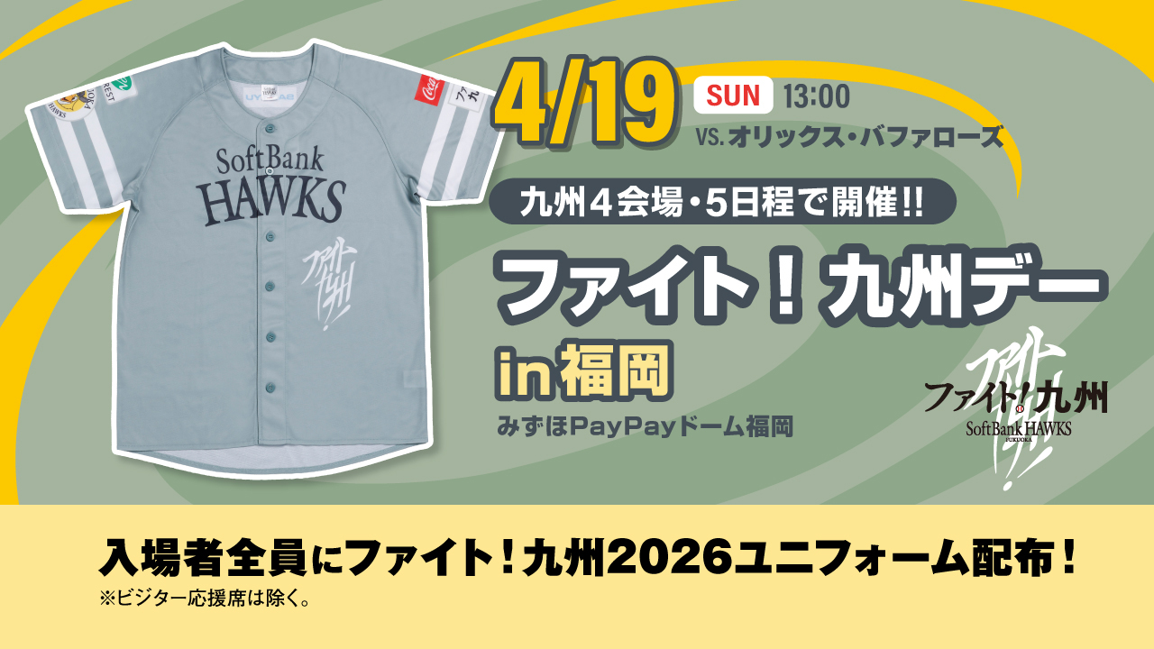 当日の観戦チケットをお持ちの入場者全員へ「ファイト!九州2026ユニフォーム」を配布します。(※ビジター応援席をのぞく)