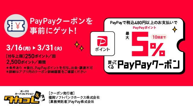 カードコレクションサービス「タカコレ」のブラウザ版で、ゲーム内通貨であるバルーンの購入時に「PayPayクーポン」をご使用いただけます!今回は全新カードの登場を記念して最大で5%のPayPayポイントが戻ってくるおトクなPayPayクーポンが登場!おトクなクーポンを使って、たくさんのバルーンをゲットしよう!