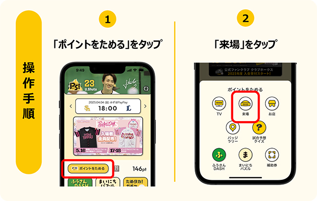 球場へのご来場時に、1回400ptでサイングッズなどが当たる「ためタカ!ガチャ」にご参加いただけます。事前にためタカ!アプリをインストールしてお越しください。