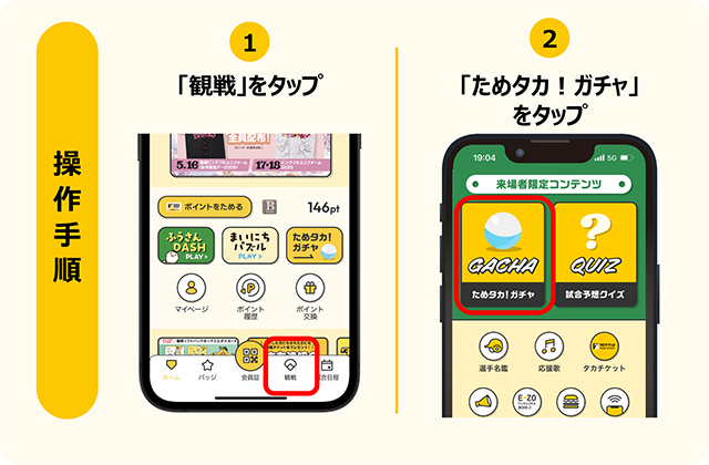 ためタカ!アプリ>「観戦」>「ためタカ!ガチャ」>「来場者限定」より、来場された試合日を選択してご参加ください。