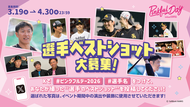 ハッシュタグ「#ピンクフルデー2026 #選手名」を付けて、ご自身がこれまでに撮影したホークス選手の写真を投稿してください。