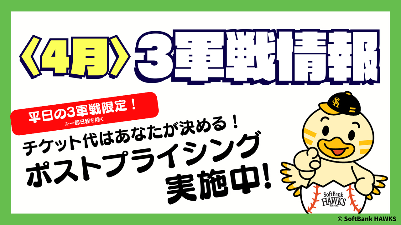 また、2026シーズンはHAWKSベースボールパーク筑後開業10周年の記念企画として、平日開催の3軍戦(※一部日程を除く)で、お客様ご自身でチケット価格を決めていただく「ポストプライシング」を実施します!なお、土日祝日に開催する3軍戦は、観戦チケットが必要となります。