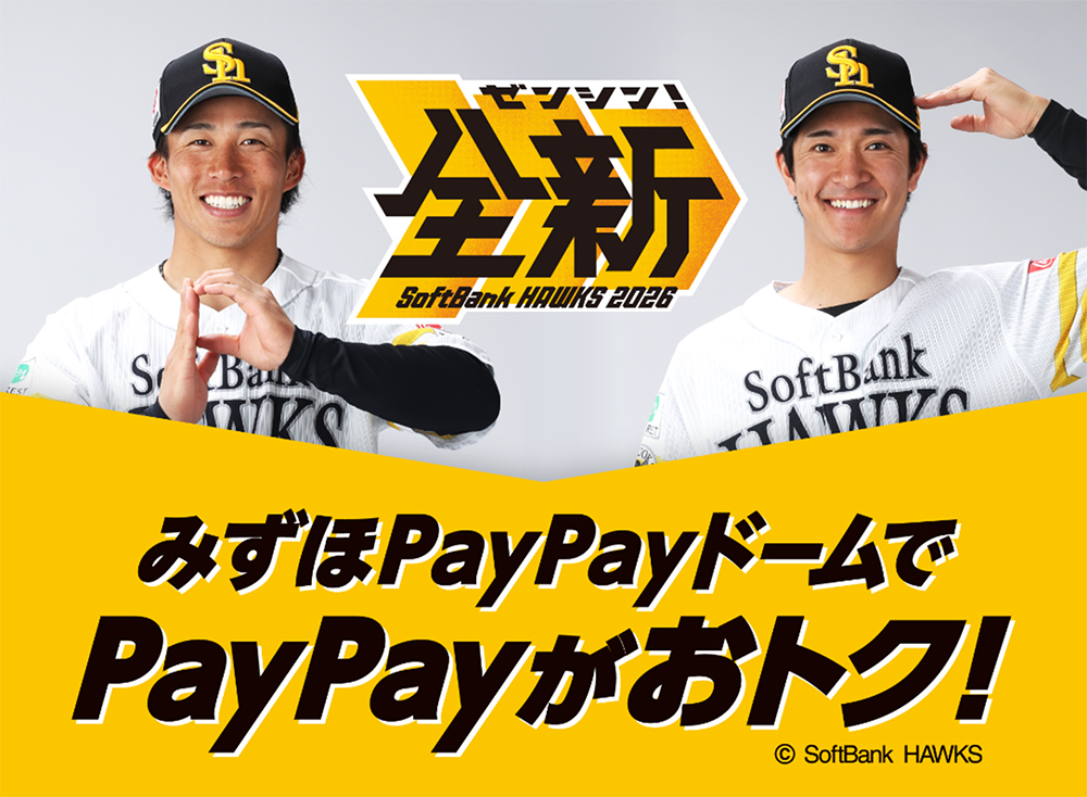 みずほPayPayドーム内またはBOSS E・ZO FUKUOKAの対象加盟店のみ。期間の条件あり。HUB、スーパーボックス、鷹マルシェは飲食クーポンの対象外。PayPayポイントは出金・譲渡不可、PayPay公式ストア/PayPayカード公式ストアでも利用可能。キャンペーン内容は予告なく変更や中止をする場合があります。